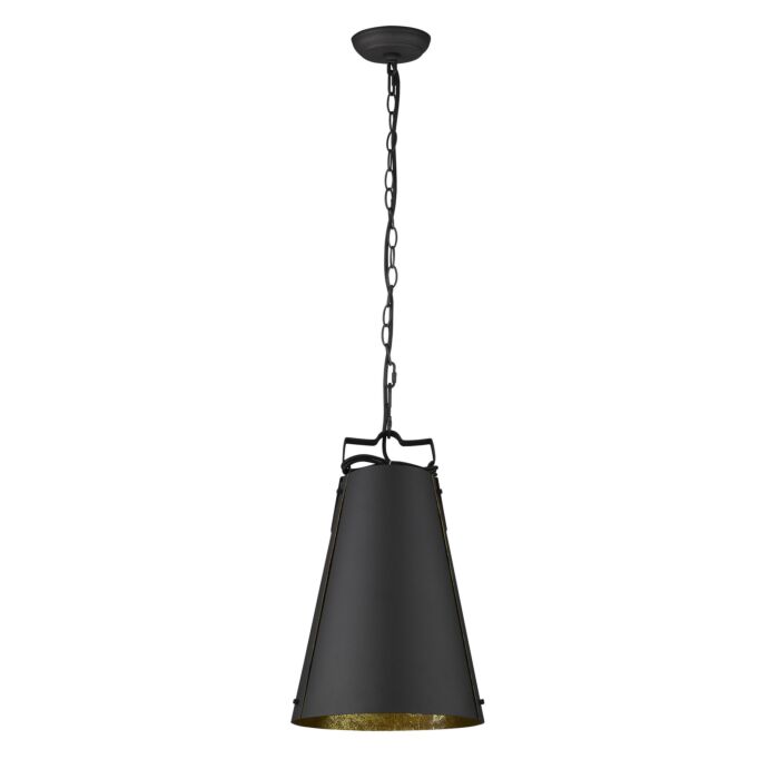 Add a dash of industrial-chic style to your space with Faza. The large black cone-shaped shade of iron commands attention. Its gold leaf interior contrasts beautifully with the matte exterior.