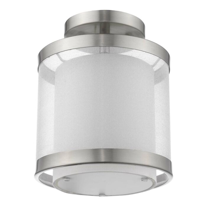 Lux 1-Light Brushed Nickel Mini Pendant With Metal Trimmed Sheer Snow Shantung Two Tier Shade