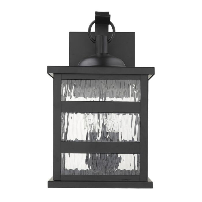 The parallel lines of this arts & crafts style are unparalleled. The morris wall lantern is reminiscent of an old-time carriage lantern but with a modern twist. A steel framework finished in matte black is accented with panels of clear water glass.- exterior wall mount