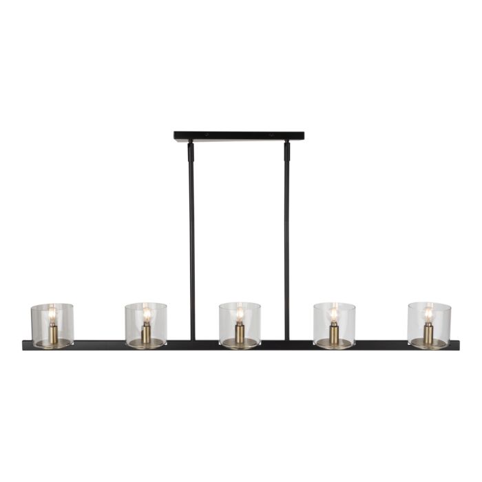 This 5-Light Island/Pool Table from Artcraft is part of the Salinas collection and comes in a Black and Brass finish.It measures 4" high x 46" wide. This light uses 5 Candelabra bulb(s). Dry rated. Can be used in dry environments like living rooms or bedrooms.