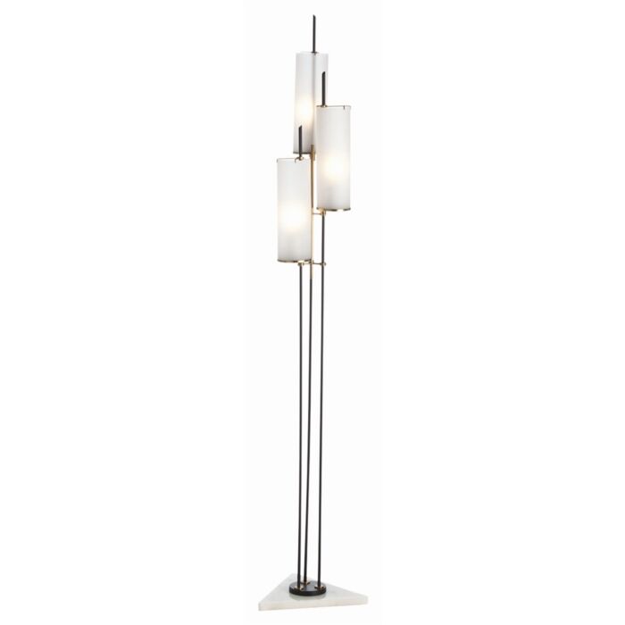 Triple light floor lamp featuring a sturdy triangular base crafted from elegant marble, topped with a series of three frosted cylindrical shades arranged in a staggered formation, supported by sleek black iron rods and adorned with ornate antique brass accents.