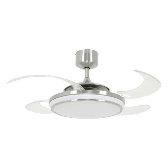 The Australian Original FANAWAY Evo1 retractable blades ceiling fan and dimmable LED light in brushed chrome with clear acrylic blades and colour shifting technology and remote control included. Fanaway US patents and Design Registrations current. US Patent 8317470, US Patent 8807938, US Patent 8790085, US Patent 9255584, US Patent 8851841. Set includes: One (1) ceiling fan with remote control. Material: PC, Steel. Finish: Brushed Chrome and Transparent. Remote Control Included. 6 inches motor. 3 speed remote. Airflow(CFM): 4169.88, 2709.99, 1187.69. Motor Wattage: 60W. Socket: LED. Dimmable. Lumen: 2600. Summer/Winter mode: No. Poles: 16Blade pitch: Variable. Wet/Damp: Indoor. Voltage: 110V. Fan watts when used at high speed: 60W. Down rod material: Steel. Power Consumption Average(wattage): 100W. ETL / CETL. Light kit: Included. Limited lifetime warranty for ceiling fan and 3 years warranty on LED. Blade dimensions: 17.52 in. L x 4.06 in.W. Downrod length: 5 inches. Ceiling Fandimensions: 16.54 inches high x 48 inches wide x 16.54 inches deep. This product will ship to you in one (1) box. Accessories pictured are NOT included. Assembly required.