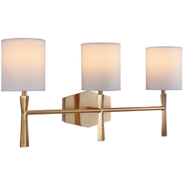 Short Description: The Chatham Collection featuring white linen shades offset by a rich satin brass finish delivers uncomplicated beauty. Available as a sconce up to a four light vanity, this damp rated collection offers an updated transitional twist to a classic style.