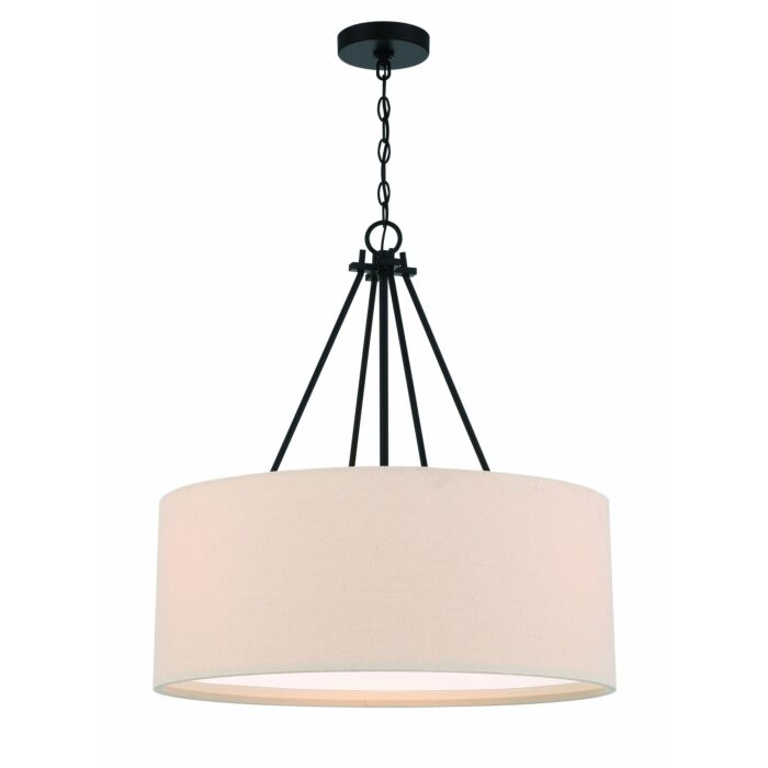 Short Description: The Duke pendant collection from Craftmade welcomes you with the curves of the crisp linen hardback drum shade complimenting the angular metal frame suspended from up to 6' of chain. The three light pendant available in 18" or 24" with white frost acrylic diffuser delivers warm illumination without the bright glare of exposed bulbs.
