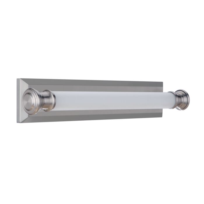 Short Description: The versatile damp rated Langston Collection featuring white frosted glass captured LED lighting that illuminates the long, narrow brushed nickel backplate, is equally at home in a bathroom, bedroom, bunkbed, library, kitchen or any space that requires an energy efficient light and can be installed vertically or horizontally.