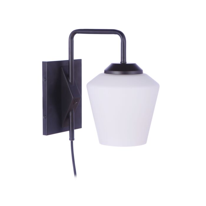 Short Description: No electrician required! The Craftmade Rive Portable 1 Light Plug-In Swing Arm Wall Sconce in Flat Black with Frost White glass shade features a convenient on/off toggle switch on the backplate, 6' plug in cord and is damp rated. Maximum 40 Watt, Medium Base Bulb (Note Included).
