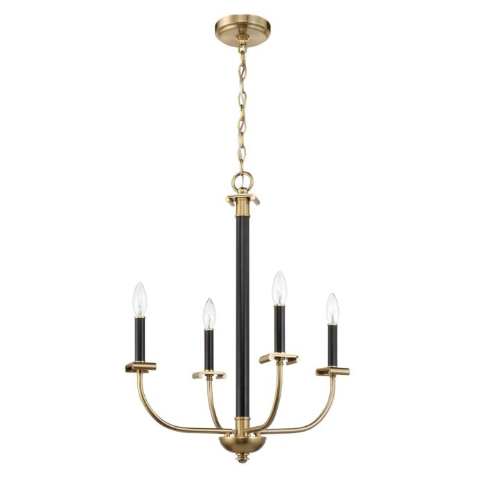 This Stanza 4-Light Chandelier in Flat Black with Satin Brass is manufacturered by Craftmade- Measures 26.37"H x 20.15" L x 20.15" W