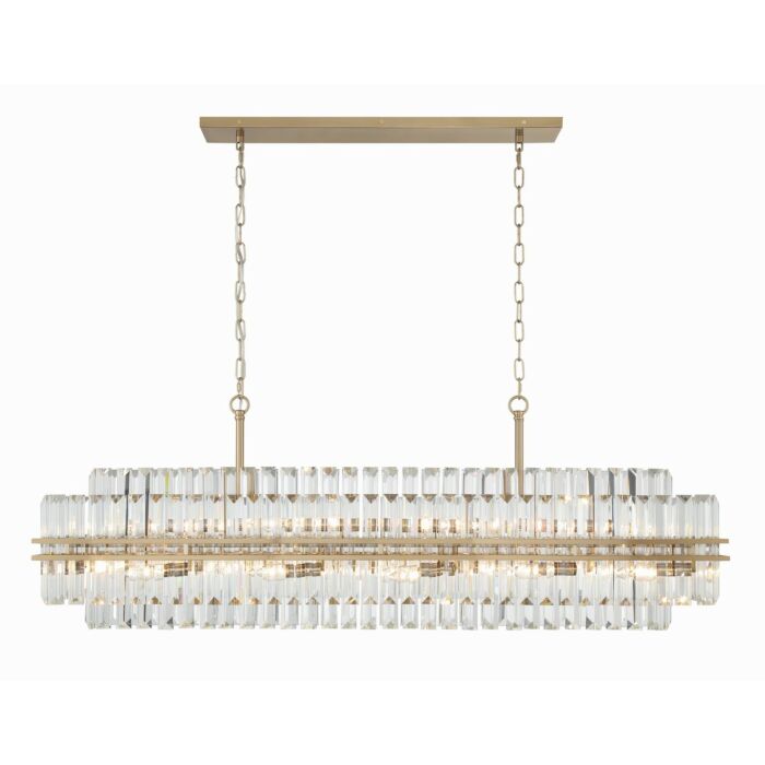 This 16-Light Chandelier from Crystorama is part of the Hayes collection. It comes in a Aged Brass finish.- Measures 18.00" H x 11.00" L x 50.00" W