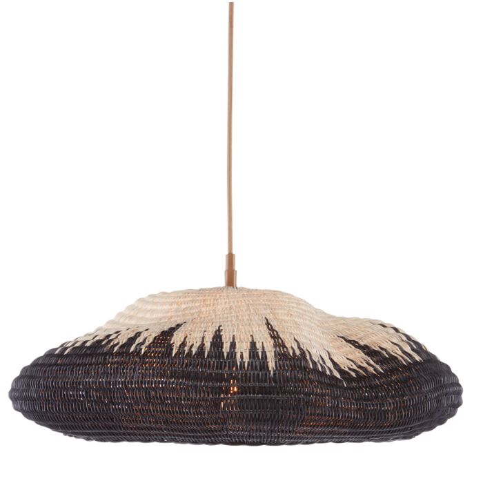 This 1-Light Pendant from Currey and Company is part of the Comme Des Paniers collection. It comes in a Khaki/Black finish.- Measures 9.50" H x 23.00" W