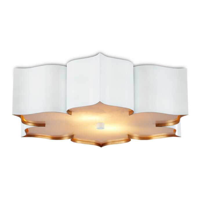 This 2-Light Flush Mount from Currey and Company is part of the Grand Lotus collection. It comes in a Sugar White/ Contemporary Gold finish.- Measures 4.50" H x 19.00" W
