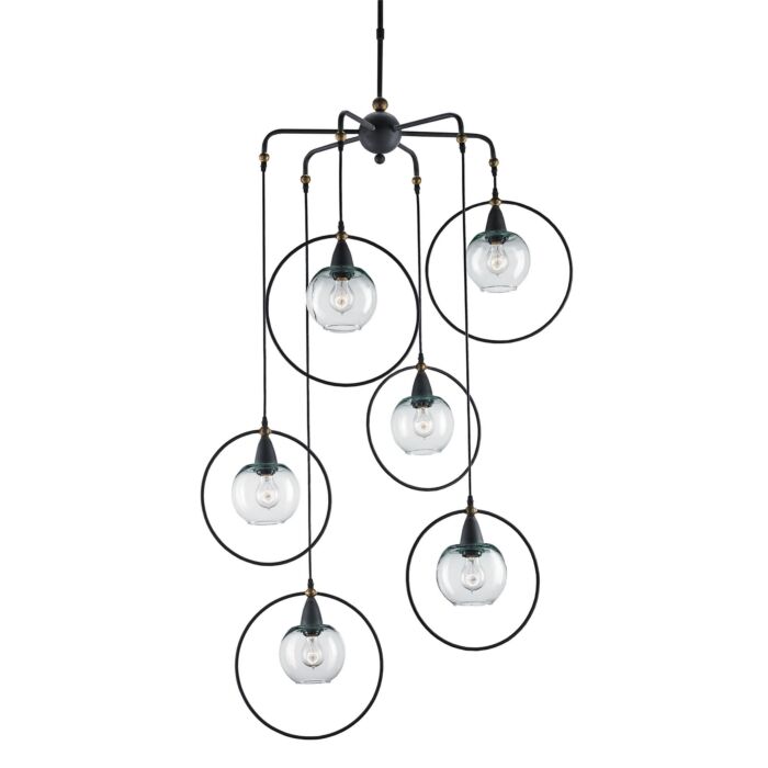 This Moorsgate 6-Light Pendant in Blacksmith with Old Brass is manufacturered by Currey & Company- Measures 69"H x 36.00" L x 36.00" W