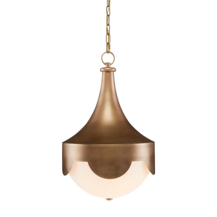 A whimsical play on a traditional pendant shape, the Pasha Pendant represents the newest generation of pared-down lines that pay homage to the lanterns that illuminate the spice bazaars in some exotic locale. Made of metal in an antique brass finish, the scalloped shade smartly flows along the frosted glass diffuser.