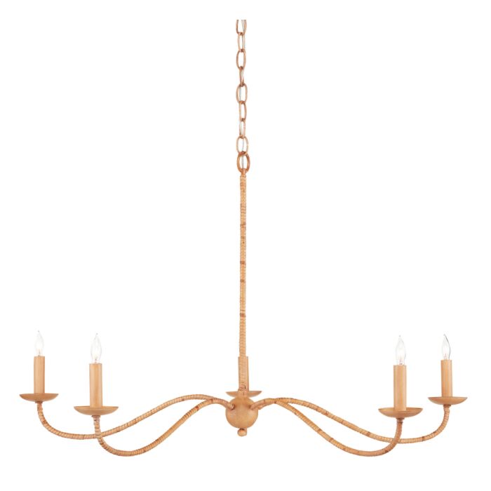 This Saxon Rattan 5-Light Chandelier in Saddle Tan with Natural Rattan is manufacturered by Currey & Company- Measures 21.5"H x 33.25" W
