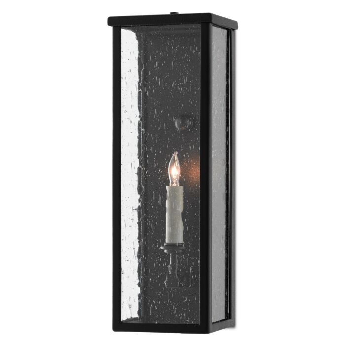 The Tanzy Small Outdoor Wall Sconce in our Twelfth Street collection of outdoor lighting features a high-performance, weather-resistant Trilux finish that is fade resistant, crack resistant and rust resistant. We guarantee the finishes applied to our Twelfth Street pieces for five years. The metal on this black post light in a midnight finish surrounds seeded-glass panes. It is certified for outdoor and damp locations, and we also offer it in medium and large sizes.