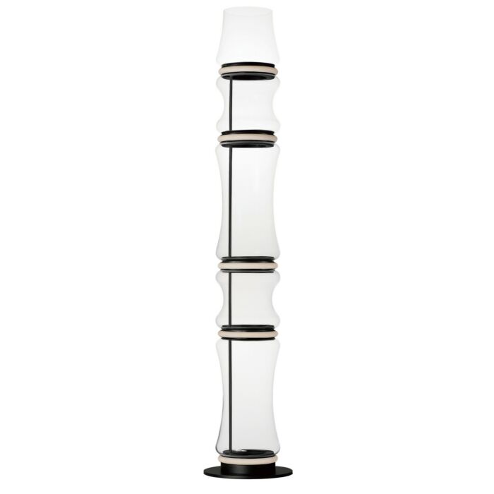 Divided into distinct sections by vibrant LED rings with a matte black finish, intricately shaped hourglass glass shades are arranged in diverse formations, featuring hand-blown glass that is completely see-through and varies in dimensions, generating a wavy pattern, with the entire collection encompassing pendant lights, flush mount fixtures, and portable lamp designs.