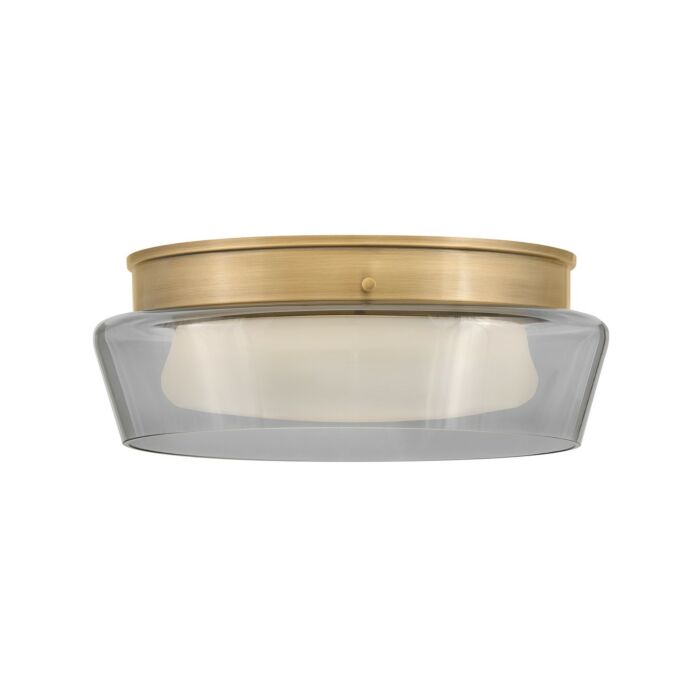 Sleek with a modern, low-profile silhouette, Demi's thick, smoked glass shade surrounds etched opal glass, creating a sophisticated effect as light diffuses from dimmable integrated LEDs. A robust canopy complements the glass with a Heritage Brass or Black Oxide finish.