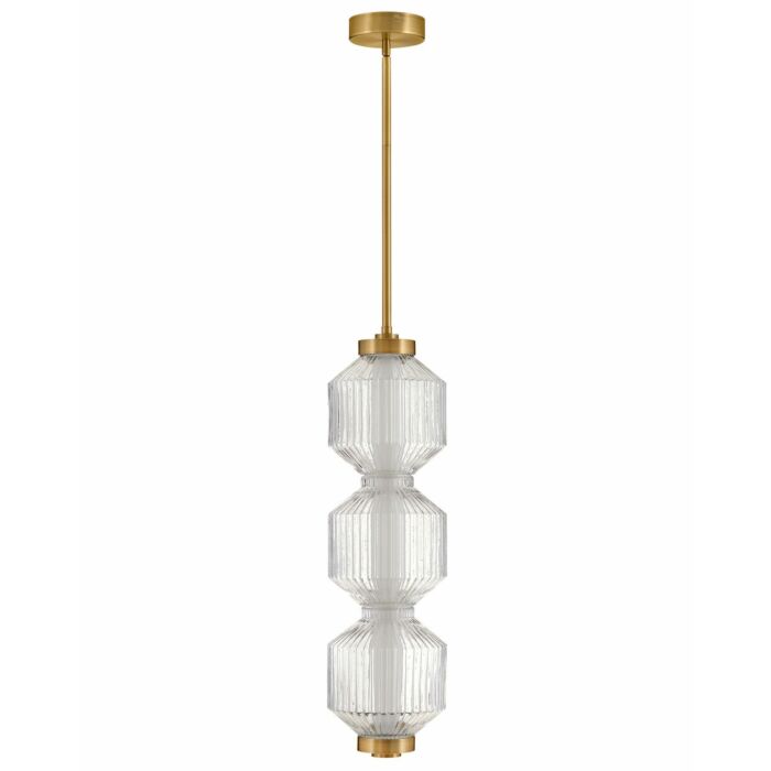 Reign's glamorous silhouette combines textural interest and transitional elements for a vibrant and versatile collection. Clear ribbed glass shades and a gleaming Lacquered Brass finish present a captivating form from any angle. Illuminated by integrated LED lighting.