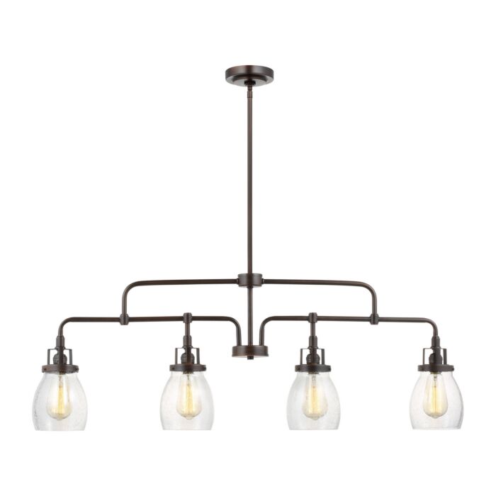 Short Description: The Belton four light linear chandelier in bronze enhances the beauty of your home with ample light and style to match today's trends. Influenced by the vintage industrial designs of early 20th Century America, the transitional Belton lighting collection has seeded glass shades and Midnight Black finish, adding a layer of retro design to the warm look.