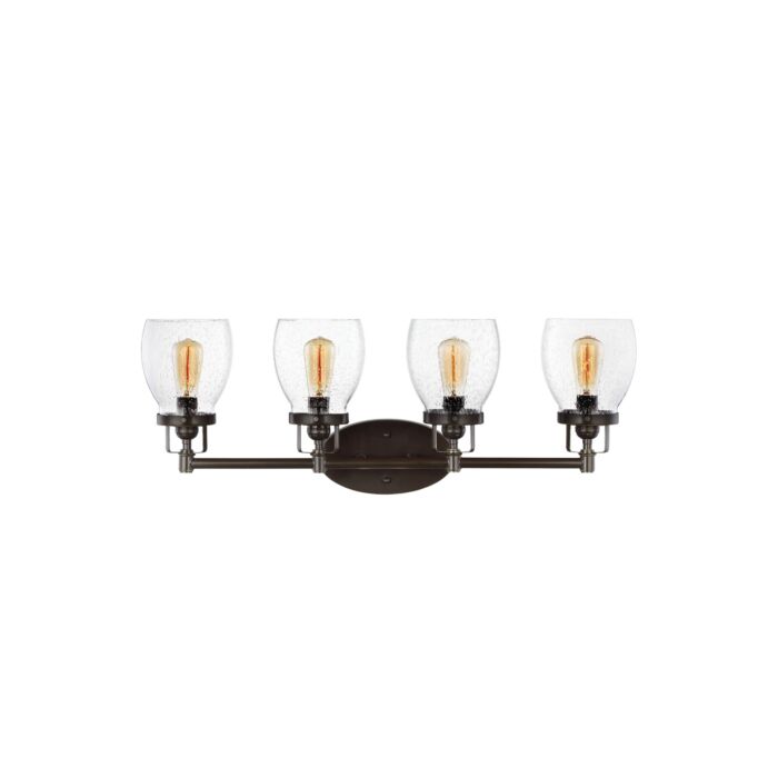 Short Description: The Belton four light vanity fixture in bronze offers shadow-free lighting in your powder room, spa, or master bath room. Influenced by the vintage industrial designs of early 20th Century America, the transitional Belton lighting collection has seeded glass shades and Midnight Black finish, adding a layer of retro design to the warm look.