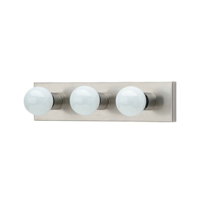 Short Description: The Center Stage three light vanity bar fixture in brushed stainless offers shadow-free lighting in your powder room, spa, or master bath room. Center Stage bath and dressing room lighting by provides generous illumination with few shadows. Center Stage brings the style of Hollywood dressing rooms to your home and provides generous illumination for getting ready! Offered in Chrome or Brushed Stainless finishes, the assortment includes three-light, four-light, five-light, six-light and eight-light vanity fixtures. Fixtures are Damp rated, California Title 24 compliant and easily convert to LED by purchasing LED lamps sold separately.