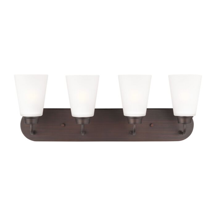 Short Description: The Kerrville four light vanity fixture in bronze provides abundant light for your bath vanity, while adding a layer of today's style to your interior design. With a simple, airy appearance, the Kerrville lighting collection by embraces its modern design roots while enhancing virtually any homes decor. Tubular steel arms extend outward and curve to present beautiful tapered, Satin Etched glass shades. The collection has a Brushed Nickel, Burnt Sienna or Chrome finish and offers three-, five- and nine-light chandeliers, a one-light mini pendant, one- and three-light pendants, a two-light semi-flush mount which can convert to a pendant, and one-, two-, three- and four-light bath fixtures. Incandescent and ENERGY STAR-qualified LED lamping are available, all fixtures are California Title 24 compliant.