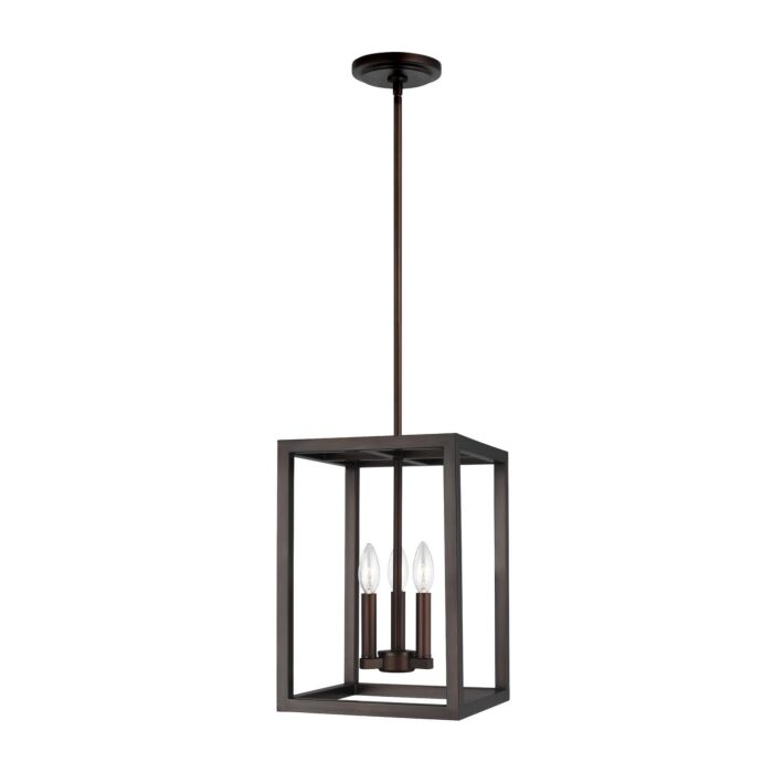 Short Description: The Moffet Street three light indoor pendant in Bronze offers a distinctive take on a rustic theme. Built in broad steel frames with hand-applied finish that mimics natural wood. This combination of rustic and urban fits comfortably in a wide variety of environments. The sharp, squared lines of the frame complement a wide variety of settings. The collection includes eight-light foyer, four-light foyer, one- light wall sconce, and a six-light island fixture. The Moffet Street Collection is available in three beautiful finishes Washed Pine, Brushed Nickel and Satin Brass All fixtures are California Title 24 compliant and damp rated for use in sheltered, damp environments.