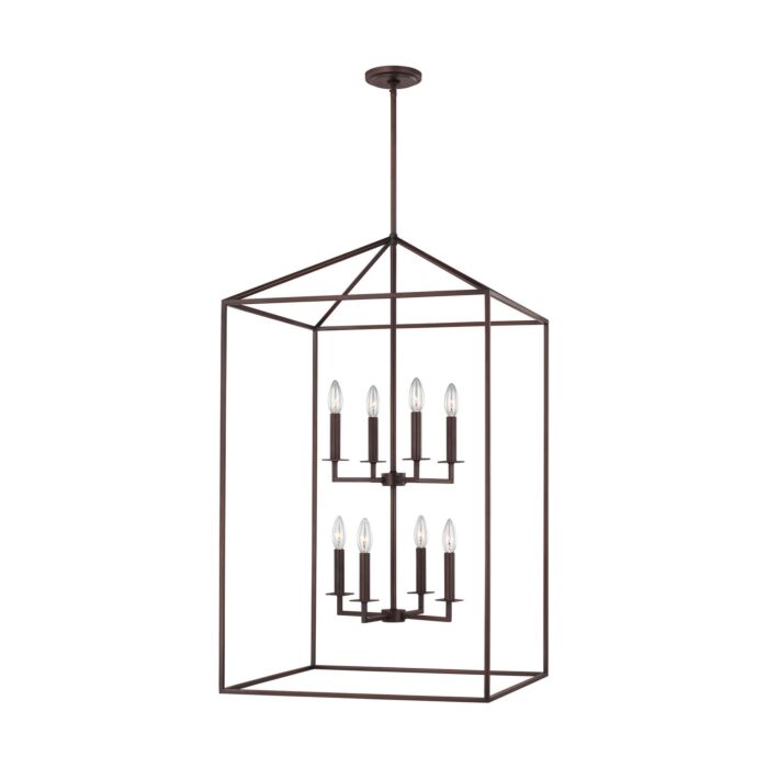 Short Description: The transitional Perryton pendant lights by are inspired by stately carriage lanterns. The updated open frame is formed with sleek square steel tubing, and each pendant is a generously proportioned, minimalist silhouette completed in either Midnight Black or Bronze finishes. Offered are small and large four-light hall/foyer pendants, an eight-light hall/foyer pendant and an eight-light island pendant. Incandescent candelabra base lamping. Damp rated, Perryton is also ideal as a focal point on a covered patio or porch.
