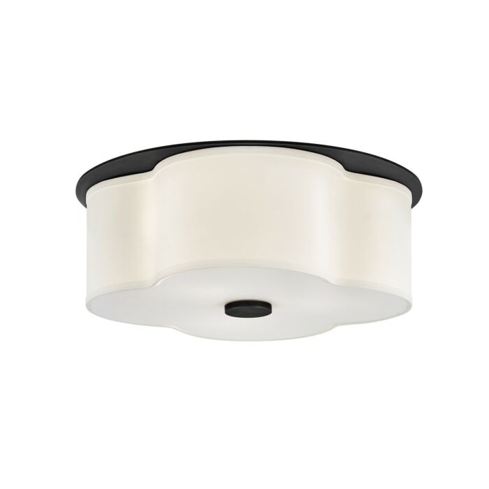 The curved quatrefoil silhouette of Delaney's off-white linen shade elegantly complements traditional aesthetics. Etched glass softly diffuses light, while an oversized decorative canopy in Heritage Brass or Black provides a subtle contrast.