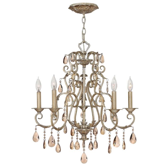 Carlton's elegant petite candelabra iron design, finished in authentic Silver Leaf, makes a sophisticated statement with luxurious amber pearl crystals, optional translucent organza shade and ornate details.