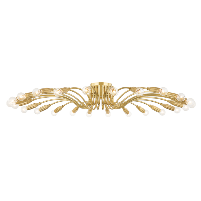 This 24-Light Semi Flush from Hudson Valley Lighting is part of the Barney collection and comes in a Aged Brass finish.It measures 6 high x 50" wide. This fixture uses 24 E12 Candelabra Base bulb(s). Bulbs not included. UL Damp rated. Can be used in humid environments like bathrooms or covered outdoor areas. Product Specification Sheet