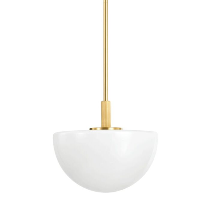 A half-round opal glossy glass shade with knurled metal details and a simple domed canopy give Lethbridge a modern industrial aesthetic. Available in three sizes and three classic finishes, this versatile pendant can work in various design styles.