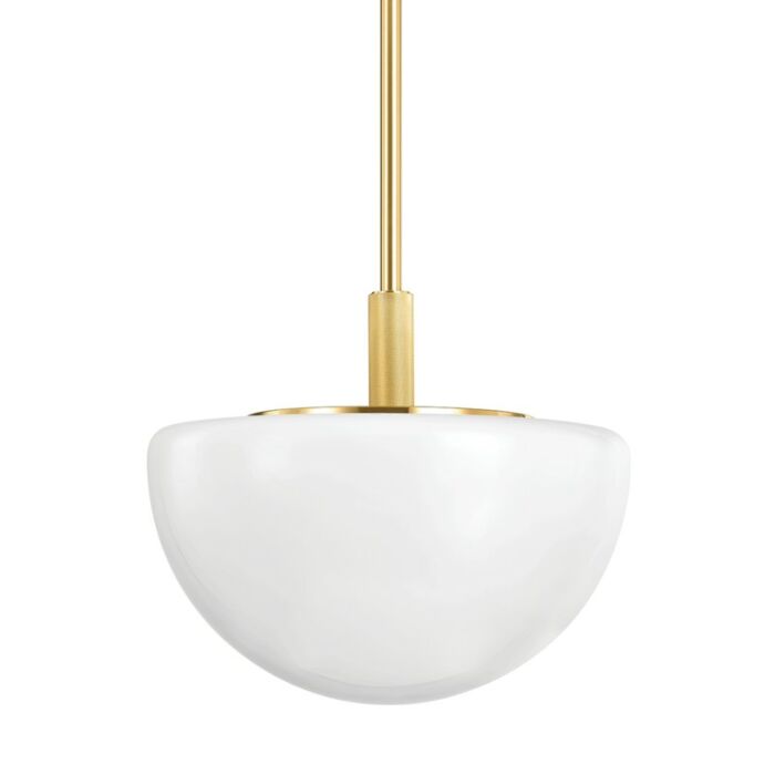 A half-round opal glossy glass shade with knurled metal details and a simple domed canopy give Lethbridge a modern industrial aesthetic. Available in three sizes and three classic finishes, this versatile pendant can work in various design styles.