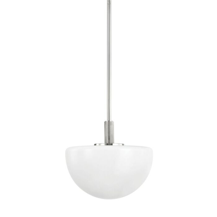 A half-round opal glossy glass shade with knurled metal details and a simple domed canopy give Lethbridge a modern industrial aesthetic. Available in three sizes and three classic finishes, this versatile pendant can work in various design styles.