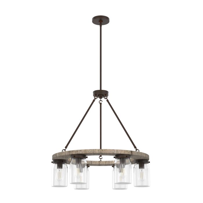 Hunter Devon Park 6-Light Chandelier in Onyx BengalSimply charming, the Devon Park round chandeliers rustic wood finishes and ball jar inspired glass shades create a look perfect for rustic and farmhouse style spaces. This chandelier provides opportunity for ample lighting. The warm glow from Edison LED bulbs creates a welcoming ambiance in your space. Mix and match with other fixtures from this collection or from our ceiling fan designs.