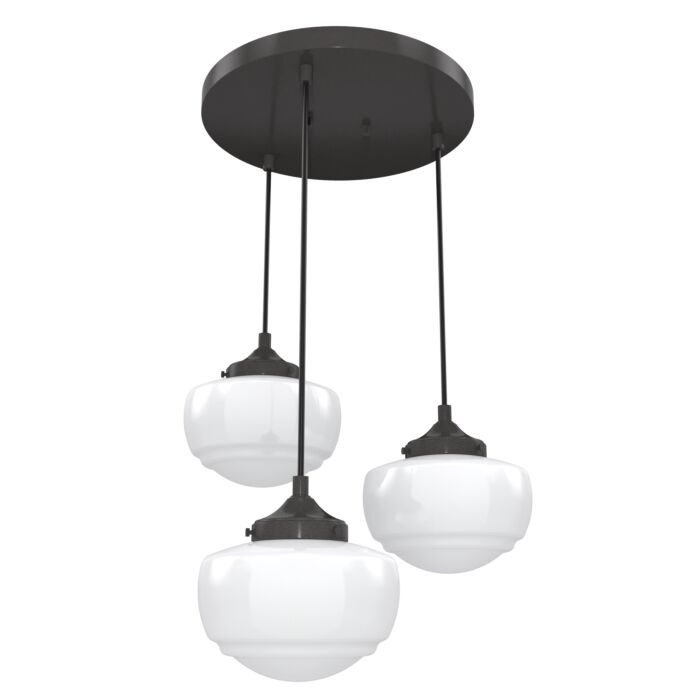 Hunter Saddle Creek Shiny Cased White Glass 3-Light Round Pendant Cluster in Noble BronzeOffering an elevated take on schoolhouse style, the Saddle Creek round cluster is designed to introduce some wow factor into your living room, great room or breakfast nook. The vintage-style of the illuminating globes are balanced by the fixtures subtle metal finish and fittings. A decorative ceiling canopy is the crowning touch on this stylish new traditional centerpiece.