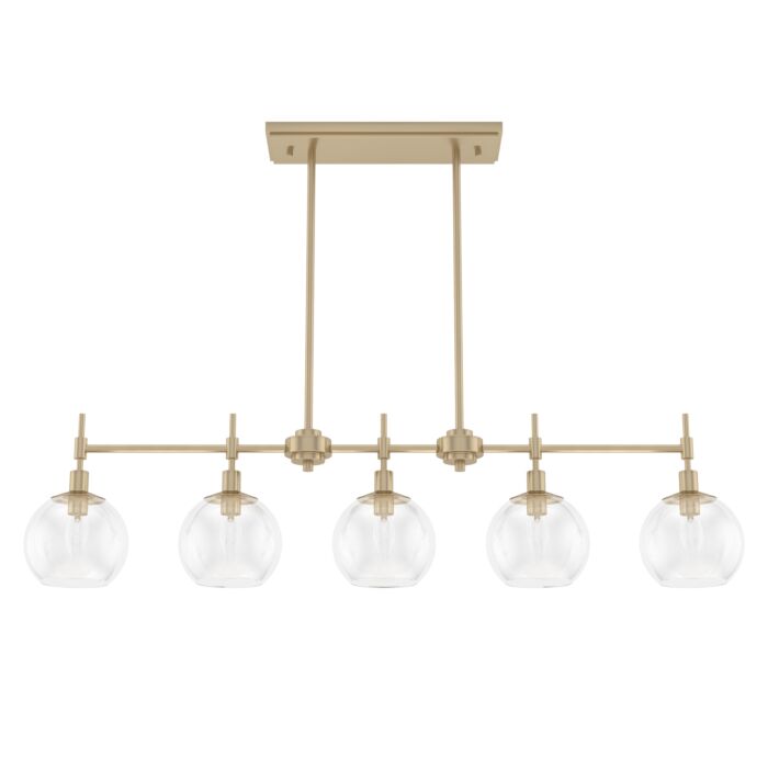 Hunter Xidane 5-Light Linear Chandelier in Alturas GoldThe graceful symmetry of the Xidane linear chandelier balances elegance with an edgy undertone. Glass orbs hang from metal, shining ambient light down as you entertain guests at your kitchen island or dining table. Make an impression by adding lights from the Xidane collection throughout your home to elevate all your spaces with the glow of glamour. Mix and match with fans from our ceiling fan collections to fully finish your space.