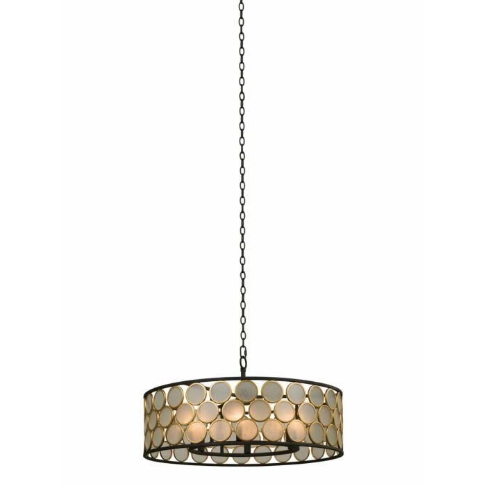 This Corsa 6-Light Pendant in Matte Black with Gold is manufacturered by Kalco- Measures 14"H x 28.00" W