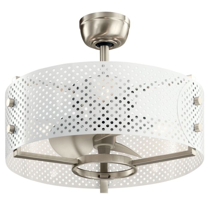 Eyrie 13 inch fandelier with a White cage and Brushed Nickel accents makes a statement in any setting. This modern industrial fandelier presents a beautiful metalwork design on the outside with a ceiling fan on the inside. The Eyrie fandelier is ideal for smaller size installations or multiple installations in a larger area.