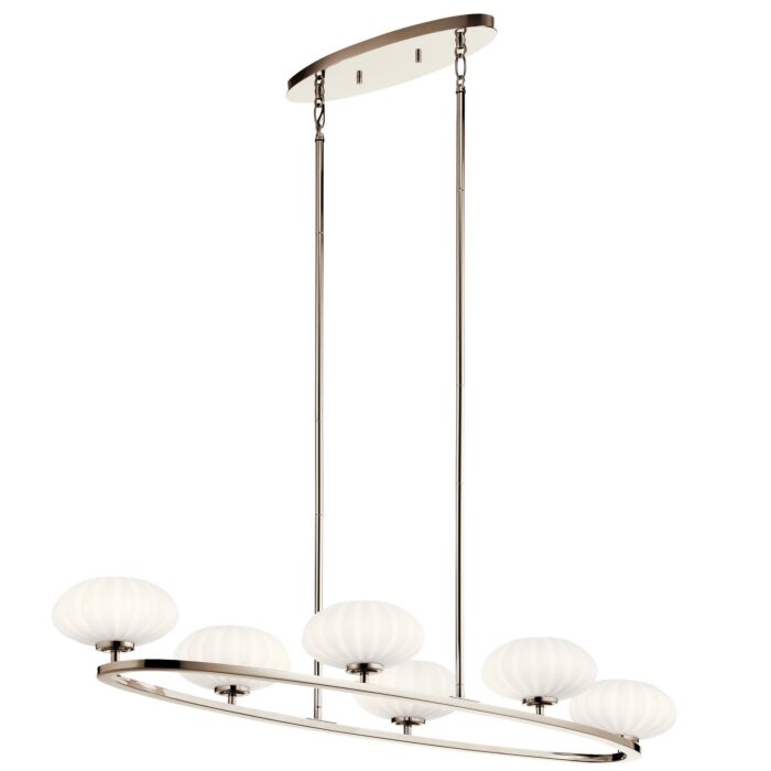 Elevate your space with the sleek and sophisticated Pim(TM) 39" 6-light oval chandelier. Boasting a timeless mid-century modern design in polished nickel, this stunning fixture is paired with rounded, satin etched cased opal glass shades that add a touch of elegance. Perfect for contemporary and transitional spaces, this chandelier is sure to make a statement.