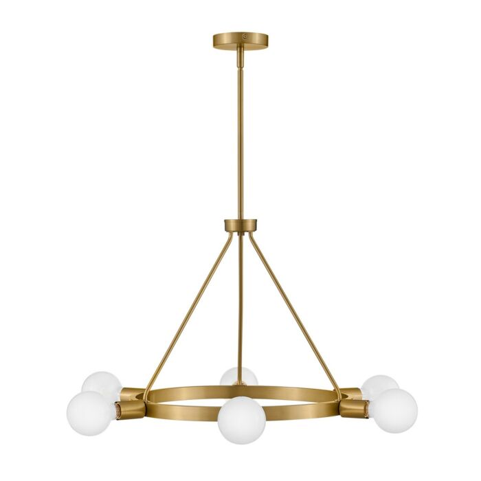This Orla 6-Light LED Chandelier in Lacquered Brass is manufacturered by Lark- Measures 17"H x 24.00" L x 24.00" W