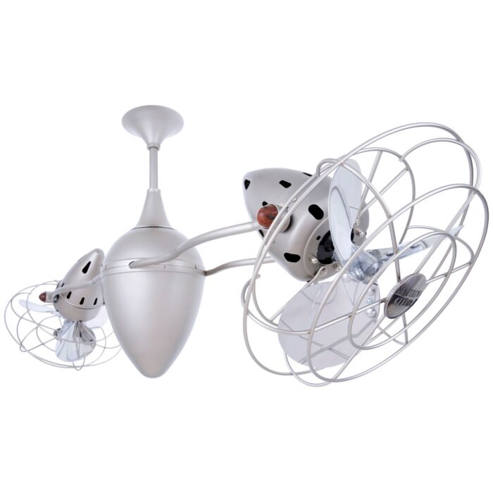 The Ar Ruthiane's unique hourglass support arms grasp bullet-shaped motor housings which rotate 360° about its teardrop center. The fan heads can be infinitely positioned in 180-degree arcs for optimum air movement, the greater the angles of the motors to the horizontal support rods (up or down), the faster the axial rotation. A slow, controlled axial rotation is achieved by both fan head position and fan blade speed. Matthews 360° rotational fans circulate heat and air conditioning more efficiently than traditional paddle fans. Constructed of cast aluminum, heavy spun and stamped steel, the Ar Ruthiane carries a limited lifetime warranty.
