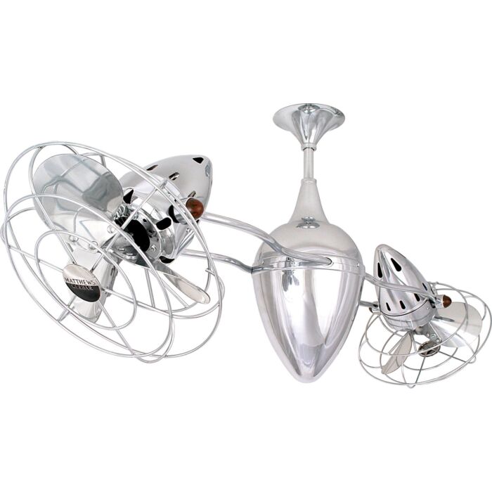 The Ar Ruthiane's unique hourglass support arms grasp bullet-shaped motor housings which rotate 360° about its teardrop center. The fan heads can be infinitely positioned in 180-degree arcs for optimum air movement, the greater the angles of the motors to the horizontal support rods (up or down), the faster the axial rotation. A slow, controlled axial rotation is achieved by both fan head position and fan blade speed. Matthews 360° rotational fans circulate heat and air conditioning more efficiently than traditional paddle fans. Constructed of cast aluminum, heavy spun and stamped steel, the Ar Ruthiane carries a limited lifetime warranty.