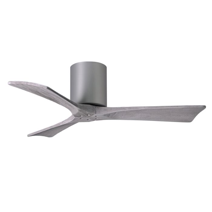 The Irene-3H ceiling-mount fan is rustic, yet strikingly modern with three neatly joined, solid wood matte black, matte white, walnut, gray ash, light maple or barn wood tone blades. A cylindrical motor housing complements its minimal profile. Irene-3H is streamline while still appearing warm and natural. Constructed of cast aluminum and heavy stamped steel, the Irene-3H has a limited lifetime warranty.