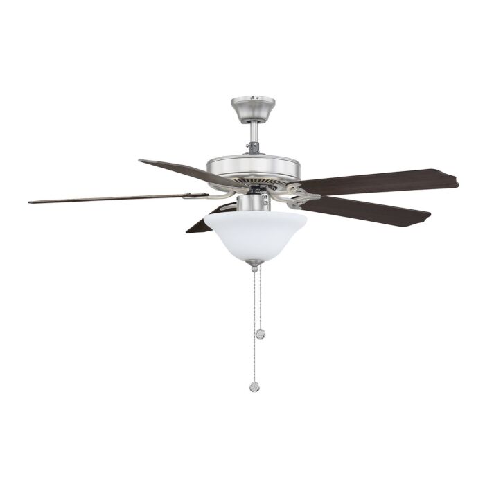This 52" 2-Light Ceiling Fan is from Meridian and comes in a Brushed Nickel finish.- This 120V light uses E26 bulbs.