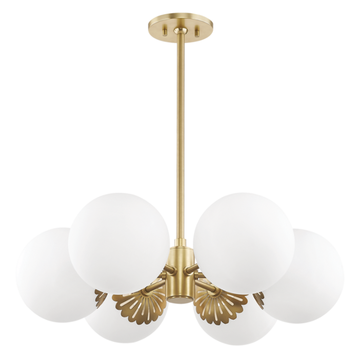 This transitional style Six Light Chandelier, part of the Paige collection, from Mitzi, comes in a Aged Brass finish.