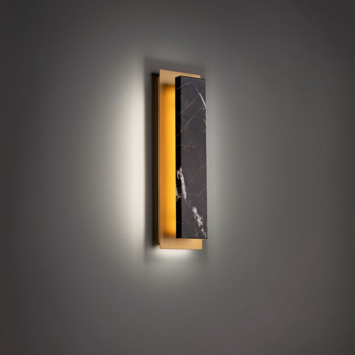 Invite the beauty and elegance of black and gold marble in your interiors with a wall luminaire that presents extravagance and glamour. LED backlighting reflects a golden glow from a rectangular aged brass metallic plane.