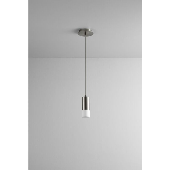This Magneta 1-Light LED Pendant in Satin Nickel is manufacturered by Oxygen- Measures 8"H x 2.75" W