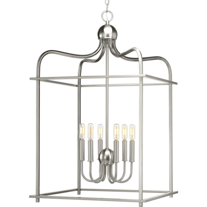 Assembly Hall provides a formal and classic open caged pendant for a variety of traditional and transitional interiors. This Design Series collection features arching frames that are great in scale and surround a candelabra cluster with matching candles. Six-Light Brushed Nickel Foyer Pendant.