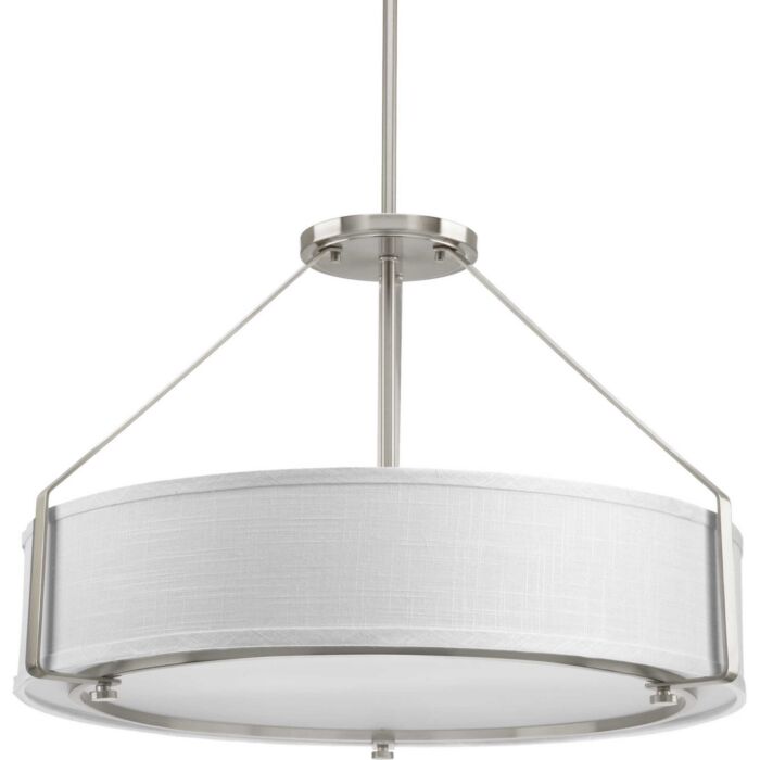 The four-light pendant offers a sleek metal frame that supports a low-slung shade to create Ratio's casual modern style. The frame's proportion to the white linen drum shade evokes a perfect ratio for lighting. Includes a polished glass exterior, etched glass interior diffuser that offers an elegant appeal and is easier to clean - offering both fashion and function. Brushed Nickel finish.