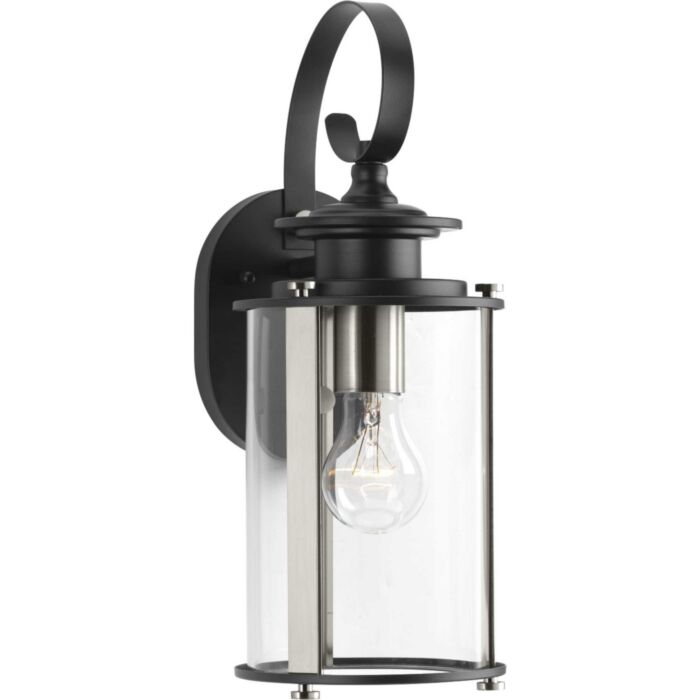 Squire one light small wall lantern features a classic traditional profile with clean, modern metal fittings. The Black finish is accented with contrasting Stainless Steel metallic elements, the cylindrical frame is comprised of a clear glass diffuser.